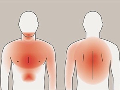 • Sometimes radiating over the entire chest, occasionally into the shoulders, arms, lower jaw, neck, back or upper abdomen